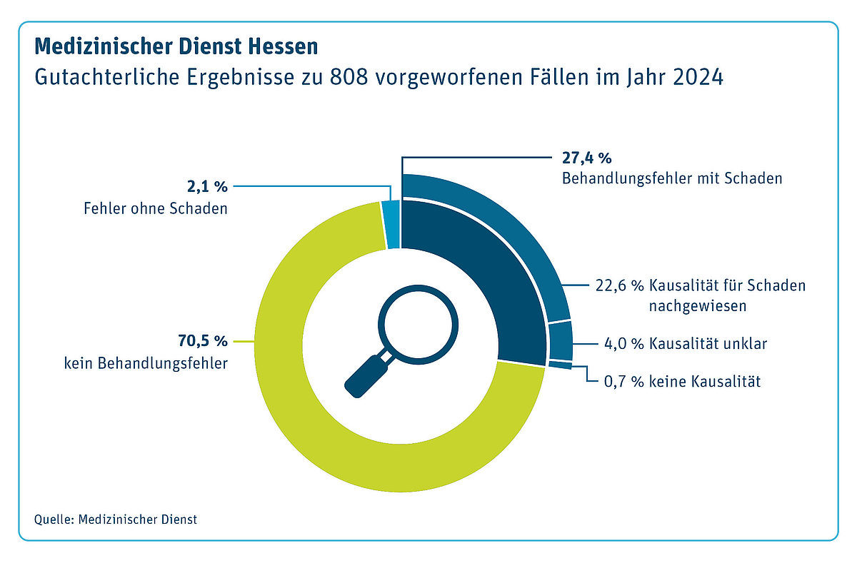 In 27,4 % der Fälle bestätigten die Gutachterinnen und Gutachter des Medizinischen Dienstes Hessen einen Behandlungsfehler mit Schaden, in 22,6 % der Fälle war der Fehler ursächlich für den erlittenen Schaden der Patientinnen und Patienten. Behandlungsfehler kommen in allen Fachgebieten vor: Das Spektrum reicht dabei von Allgemeinmedizin über Orthopädie und Unfallchirurgie, Gynäkologie, Viszeralchirurgie bis hin zur Zahnmedizin.