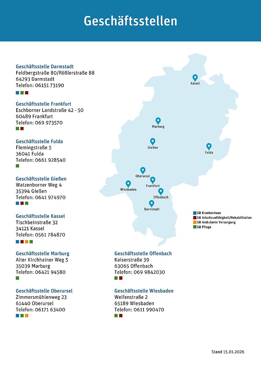 Der Medizinische Dienst Hessen ist mit seinen Geschäftsstellen dezentral an neun Standorten vertreten. Auf diese Weise kann eine wohnortnahe Begutachtung von Versicherten sichergestellt werden.